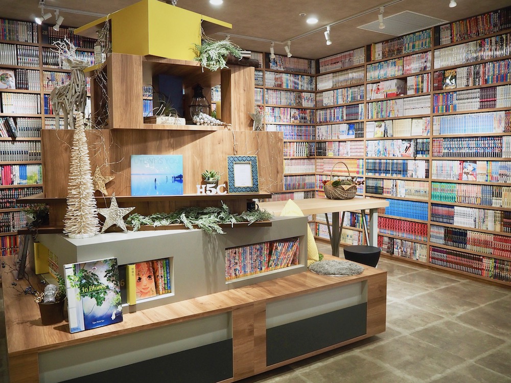 中央には本がディスプレイされたオブジェがあり、腰かけて漫画を読んだりと、自由な時間を楽しむことができます。