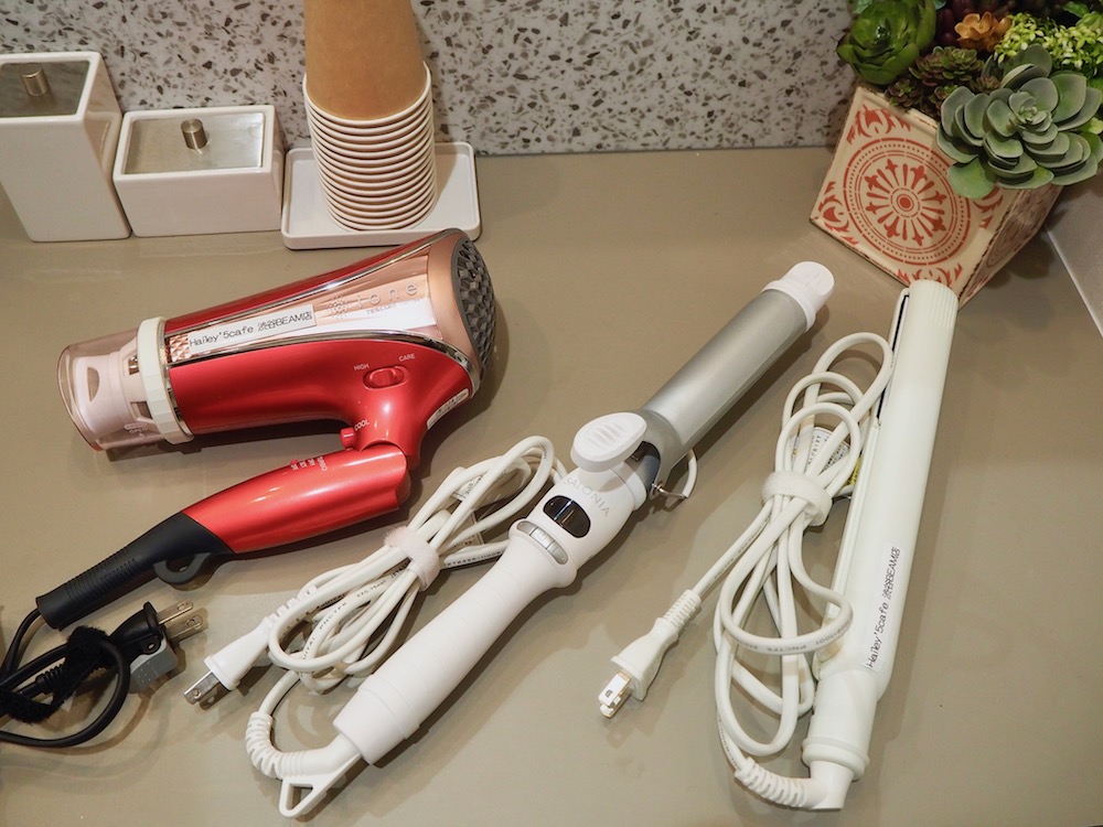 広々として清潔なシャワールーム(要予約)もあり、ドライヤー、ヘアアイロン(カール&ストレート)、ミラー、アロマオイル、各種充電器なども無料レンタル可能!