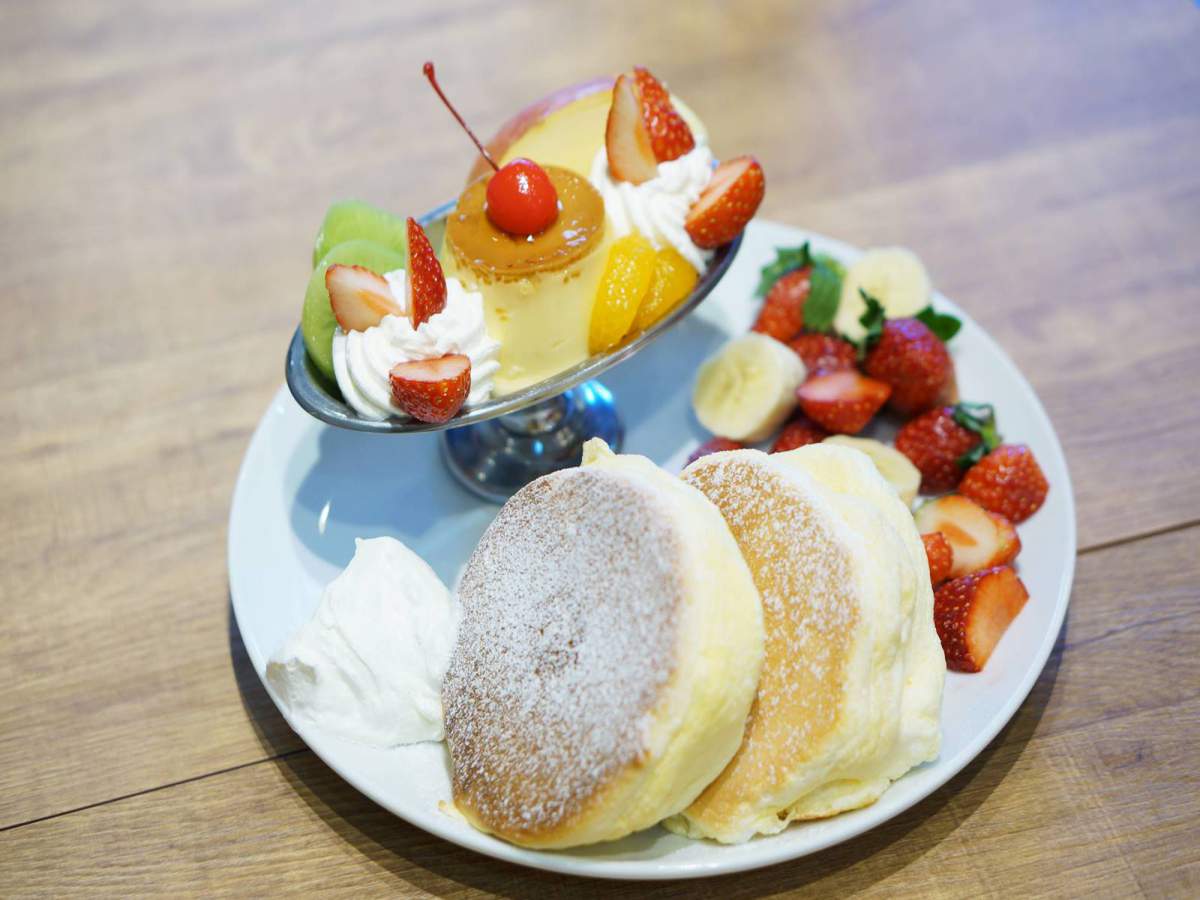 プリンアラモードとパンケーキが一緒に食べられるなんて夢のよう!