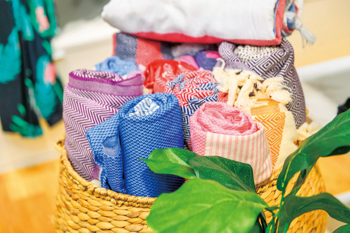 ファッション小物やステーショナリーも充実の品揃え。インテリアのアクセントにも使えそうなビーチマット各$ 42はカラフルなラインナップで好みの色が見つかります。