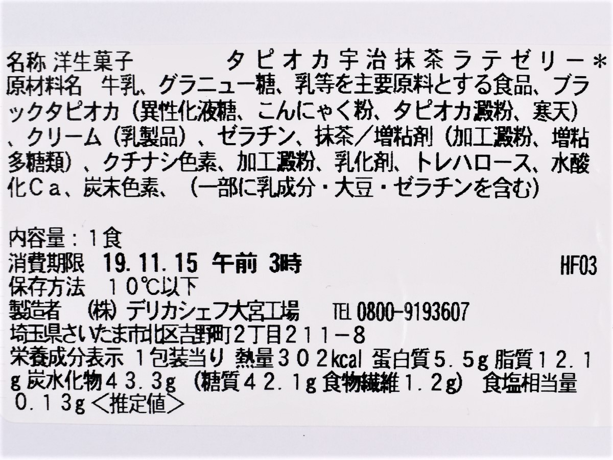 抹茶の緑色が色鮮やかな同商品には、タピオカとゼリー以外にもクリームやムースがたっぷり。よく見ると4段に分かれているようで、上から抹茶クリーム、抹茶ムース、抹茶ゼリー、ブラックタピオカが入っていました。とことん抹茶を味わえそうなスイーツですね。ちなみに、同商品のカロリーは302Kcalほど。高くもなければ低くもない印象です。