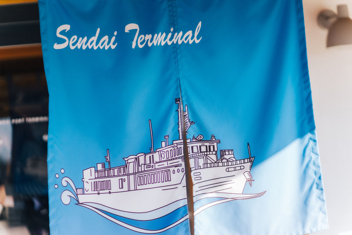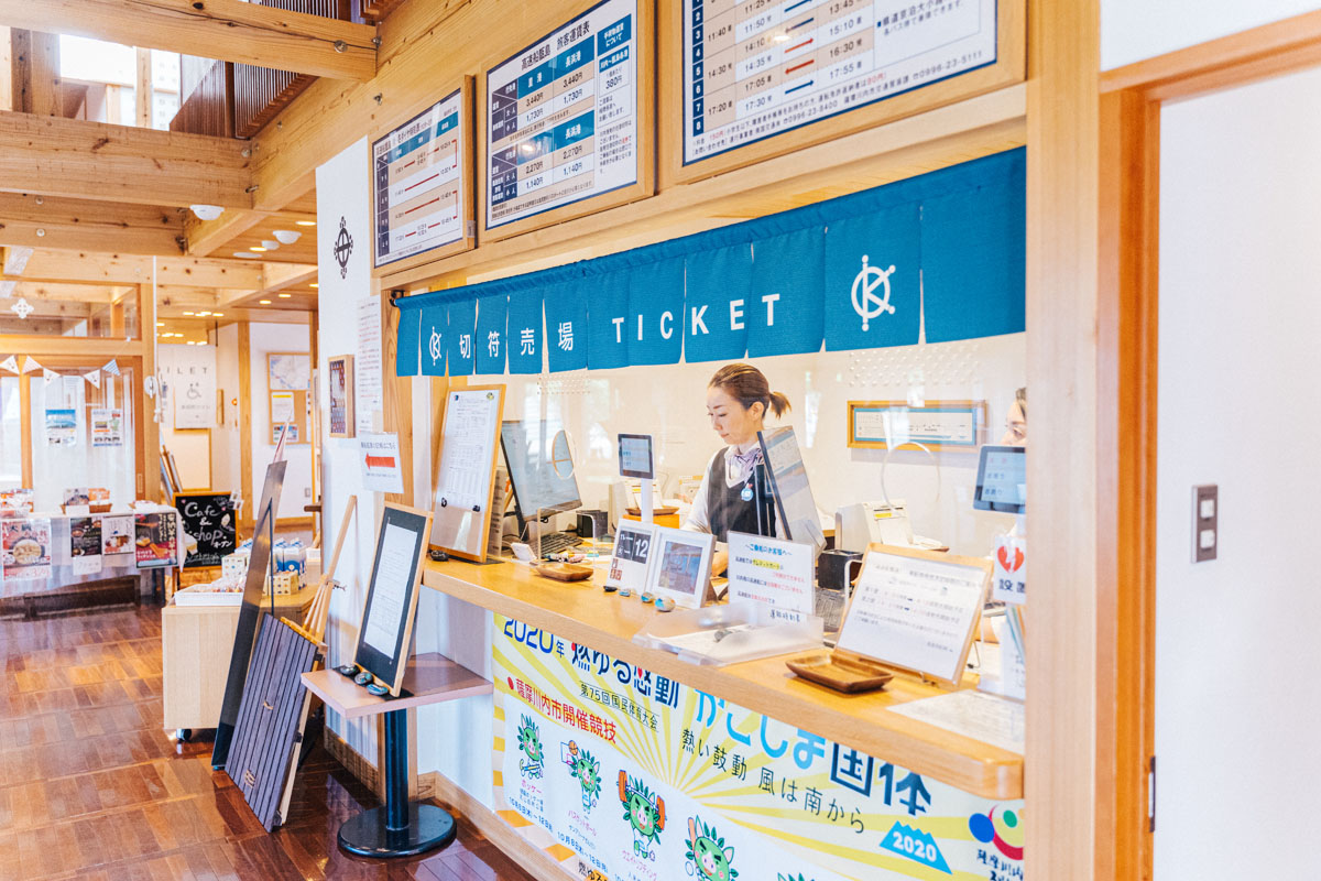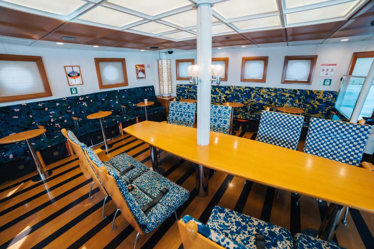 今回川内港ターミナルから乗船したのは上甑島行きの「高速船甑島」。この高速船が先述したとんでもなくおしゃれな船です。九州新幹線などを担当した水戸岡鋭治氏デザインによるもので、船内だけではなく、川内港ターミナルも水戸岡ワールドが随所に見られます。一般的な高速船の内装の概念、覆ります。