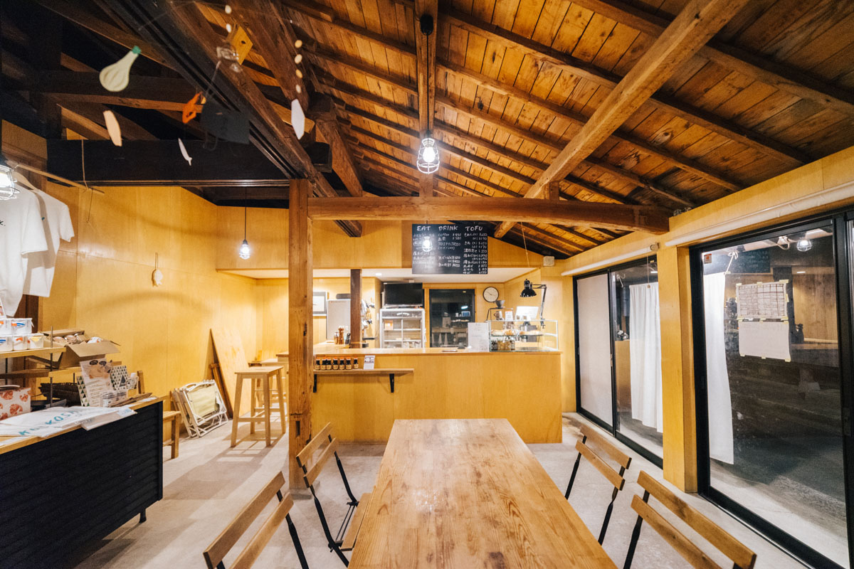 まずは山下商店。ここはもともと山下さんが古民家をリノベーションしたショップ。住宅街の中に突如現れるおしゃれ空間です。朝3時から仕込むという島豆腐は、九州産の丸大豆(フクユタカ)を使用し、木綿豆腐190円・絹ごし豆腐250円、濃厚ざる豆腐350円などがあります。この豆腐は山下さんが経営する「FUJIYA HOSTEL」の朝食でいただくこともできます。