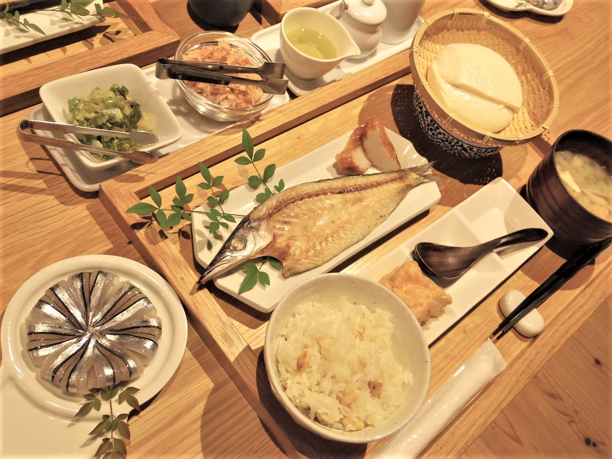 今回は朝食もいただきました。地魚のカマスにきびなごの刺身、「山下商店」のざる豆腐や厚揚げも。お豆腐は島の塩や醤油、自家製ネギ油など、いろんな薬味でいただくことができます。ボリュームもあるように見えて、なめらかな口当たりなので、朝からぺろりと食べてしまいました。
