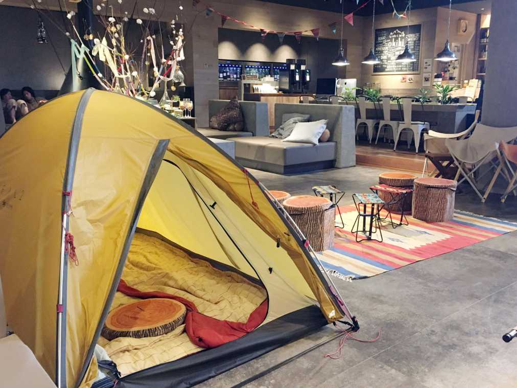 館内にはゆらゆら宙づりテントやハンモックなどが!まるでキャンプをしているような気分で、自由気ままな時間を過ごしてくださいね。