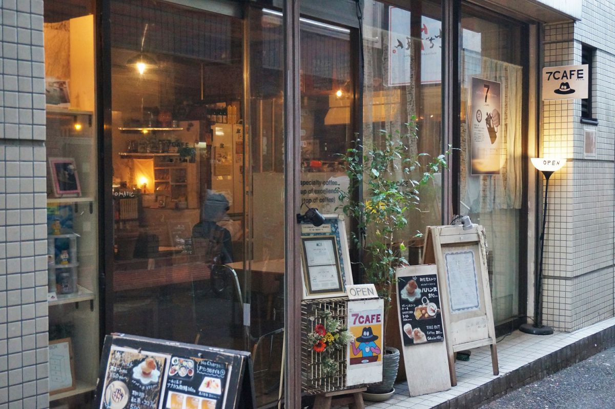 京王新線の幡ヶ谷駅北口から徒歩30秒。「7CAFE(ナナカフェ)」は、帽子の絵が描かれた看板が目印です。