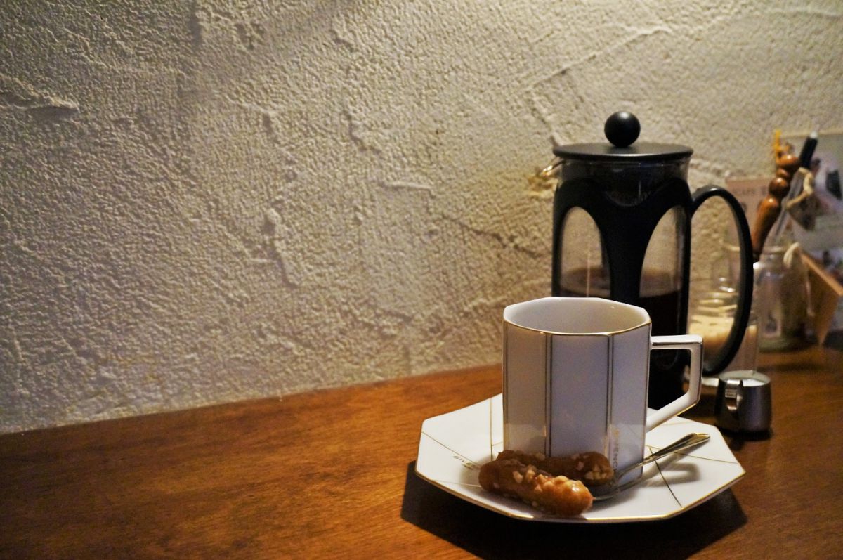 フレンチ・プレスで提供されるコーヒーはカップ2杯分入っているので、とってもお得!しかも、かりんとう付きです。