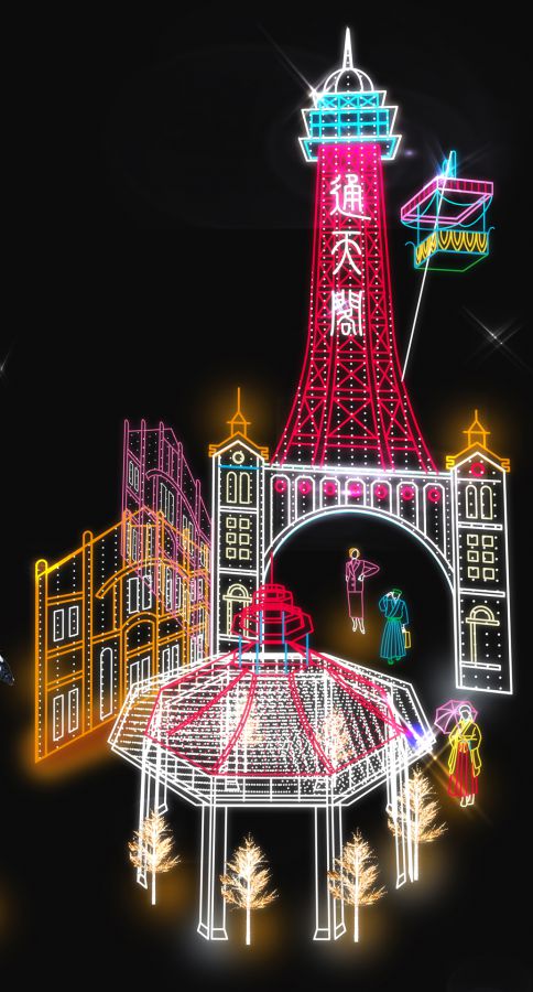 大阪のシンボル通天閣には、かつて隣接してロープウェイやメリーゴーラウンドがあったことをご存知でしょうか? 100年前の通天閣界隈のキラキラした時代をいくつもの輝く光が再現。光の中に「幸福の神」ビリケンさんを発見したら、足を撫でてみましょう!ご利益があると言われています。