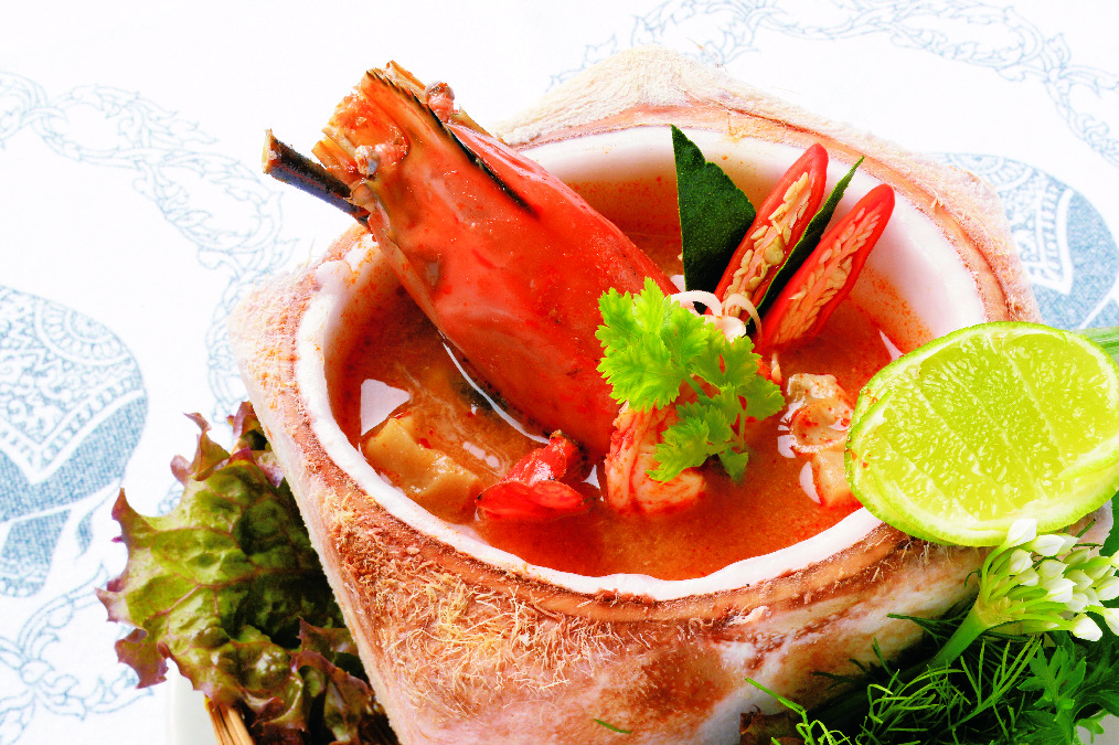 王宮式トムヤムクンTom Yam Koong Chao WangB360はアンダマン海産の大クルマエビを使い、ココナッツの器に盛った王宮風。エビの味が濃厚でたまりません。