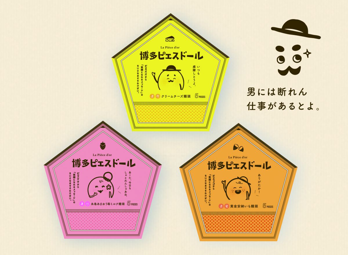 パッケージをリニューアルした濃厚チーズのチーズ饅頭と、香り豊かな糸島あまおう苺ミルク饅頭はお菓子にもお酒とのペアリングもぴったり。さらに新登場した黄金安納いも饅頭もおすすめです。新キャラクターのピエドールファミリーと博多弁で書かれたメッセージはほっこりすること間違いなし!