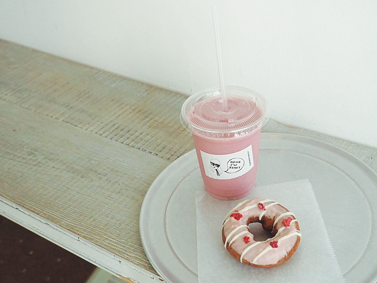 さらなる“映え”に一役買うのが、人気のドーナツ「ベリーベリー」と「ストロベリースムージーです。雑穀がブレンドされたドーナツには、淡いピンクのチョコレートとドライストロベリーがトッピングされて心地のよい口当たり。「ストロベリースムージー」はオリジナルのキャラクターを描いたシールが貼られた、かわいいカップに入っています。自然なフルーツの甘みが口いっぱいに広がり、飲むほどに幸せな気分に…!