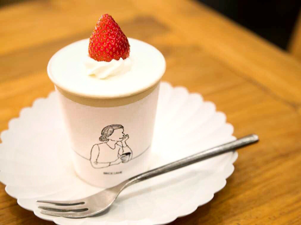 クリームの上にイチゴがちょこんと乗ったかわいらしい見た目。紙コップを使ったショートケーキは、きび砂糖を使ったスポンジのやさしい甘さが際立ち、ラテやコーヒーにもぴったり。季節ごとにフルーツが変わってお色直ししていく姿も注目したいところ。このケーキを目当てに、何度も足を運ぶ人がいるのもうなずけます。