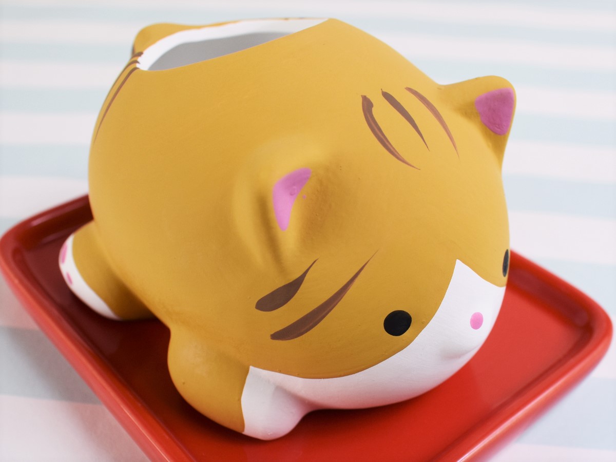 箱から商品を取り出すと、茶色の丸っこい猫がお目見え。お尻のあたりにはぽっかりと穴が空いており、中身は空洞となっています。見た目のかわいさから、部屋に飾るだけでも癒されそうですね。陶器以外にも、真っ赤にカラーリングされた台が同梱。陶器は軽いですが、台はずっしりとした重さです。