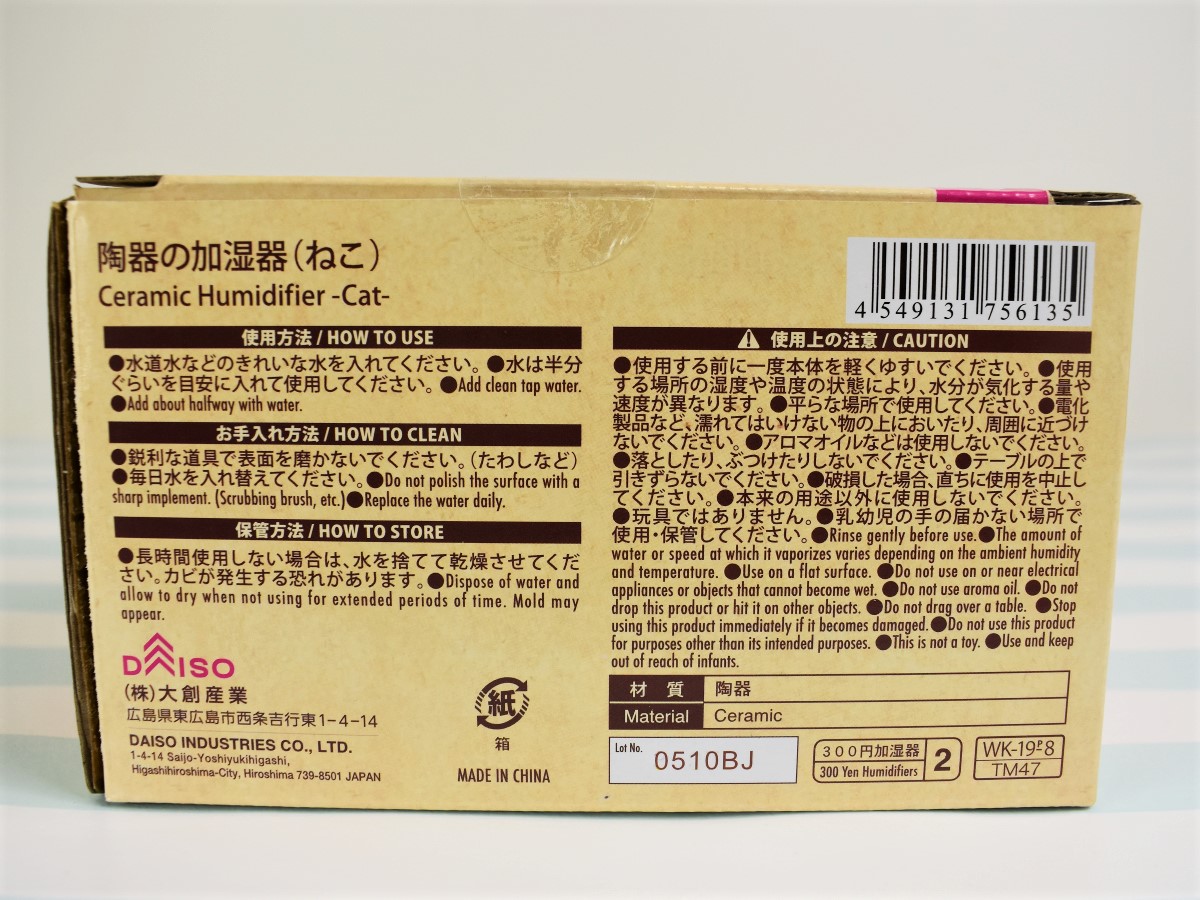 冬は空気が乾燥してきて、そろそろ加湿器を使い始める人も多いのではないでしょうか。そこで今回は330円で購入してきた、ダイソー「陶器の加湿器(ねこ)」をピックアップ。水を入れるだけでじんわりと加湿してくれる、かわいらしい猫型の陶器です。さっそく水を入れて試してみましょう。
