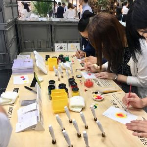 とっても珍しい 「香りのする絵具」の体験ブース(1枚2000円)も。ラベンダーやゼラニウムなどの香りの絵具が楽しめる「香の具」を使って塗り絵ができます。選べる台紙の絵柄は3種類。参加者がもらえる「香の具」4色セットは2568円相当するので、ひたすらお得です。