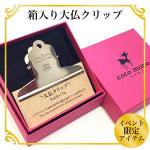 こちらは奈良にある文房具と雑貨のお店「coto mono」で販売している大仏クリップ。大仏様まで東京に来てくれたんだなとうれしくなりました。今回は「文具女子博」限定で貼り箱入りでの販売。見た目のインパクトだけでなく、コピー用紙を100枚も挟むことができる、非常にありがたいクリップです。
