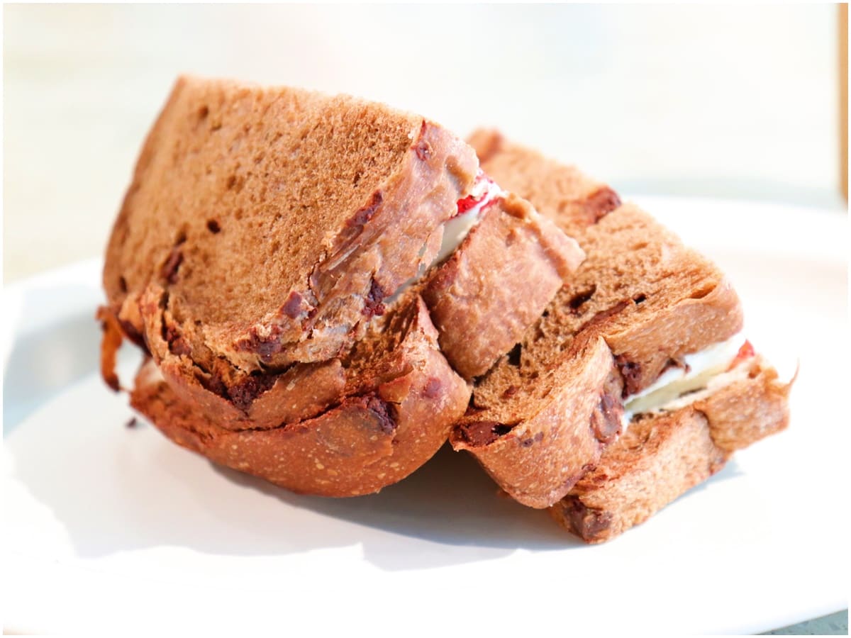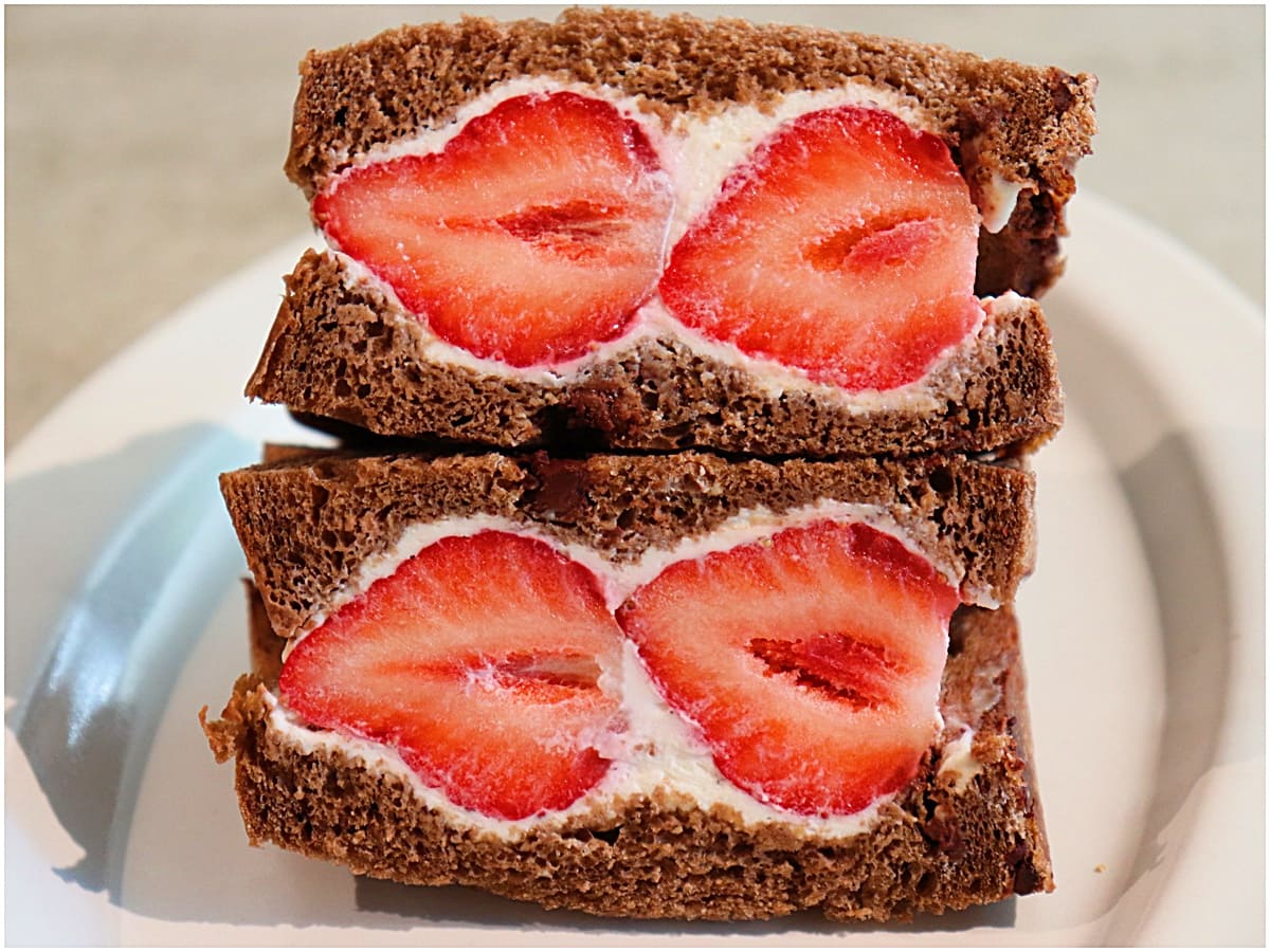 「あまおういちごとマスカルポーネサンド」には、フランス産ヴェローナ社のチョコレートを使用した食パン「ガトーショコラ」が使われています。