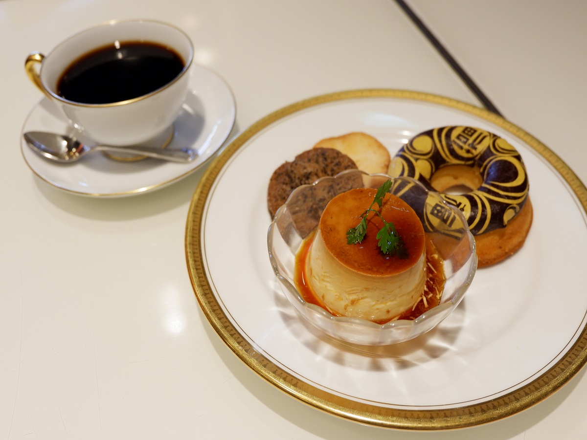 プリン・ドーナツ・ラスクがセットになったスイーツプレートに、飲み物がセットになったお得なメニューです。