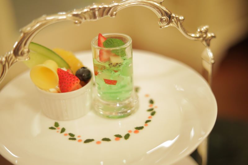 クリスマスリースをイメージしたデコレーションがかわいいデザートプレート。フルーツたっぷりの「プリンアラモード」と「白ワインとミントのマチェドニア」。マチェドニアは白ワインを使用しているものの、アルコール分は飛ばしているそうなので、お酒は苦手!な人でも大丈夫。