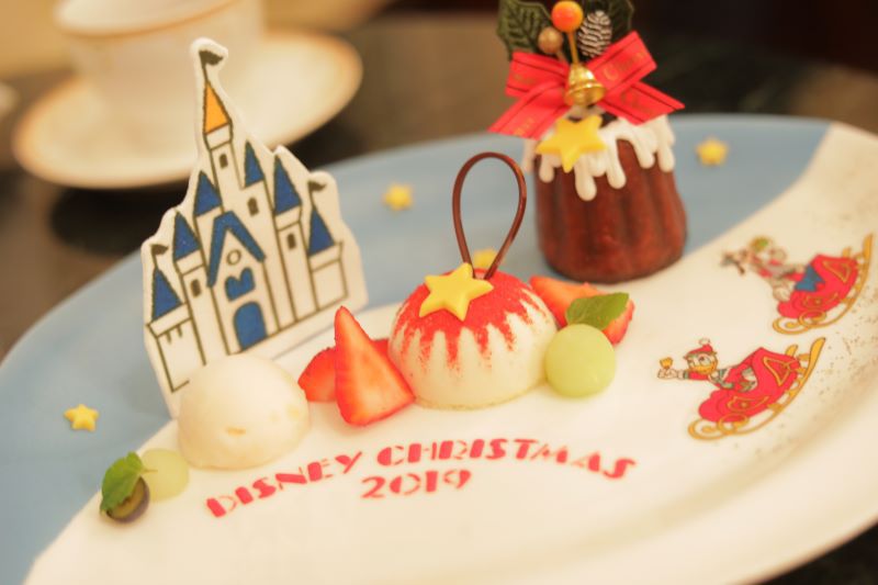 そりに乗ったドナルドとグーフィーが描かれた大皿のプレートには「カヌレ」のほか、「マスカルポーネとストロベリームース」、「アップルソルベ」は果肉も入っていて食感も楽しめます。