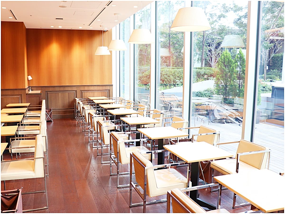 庭園側は全面ガラス張りになっていて、窓からは「赤坂プリンス クラシックハウス」のモダンな洋館が見えます。