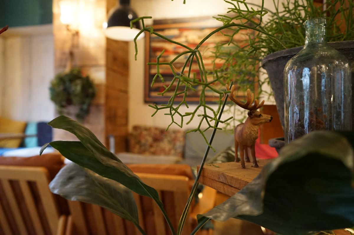 店内はたくさんの植物とアンティーク家具であふれ、どこかログハウスを思わせる温かくやさしい雰囲気。