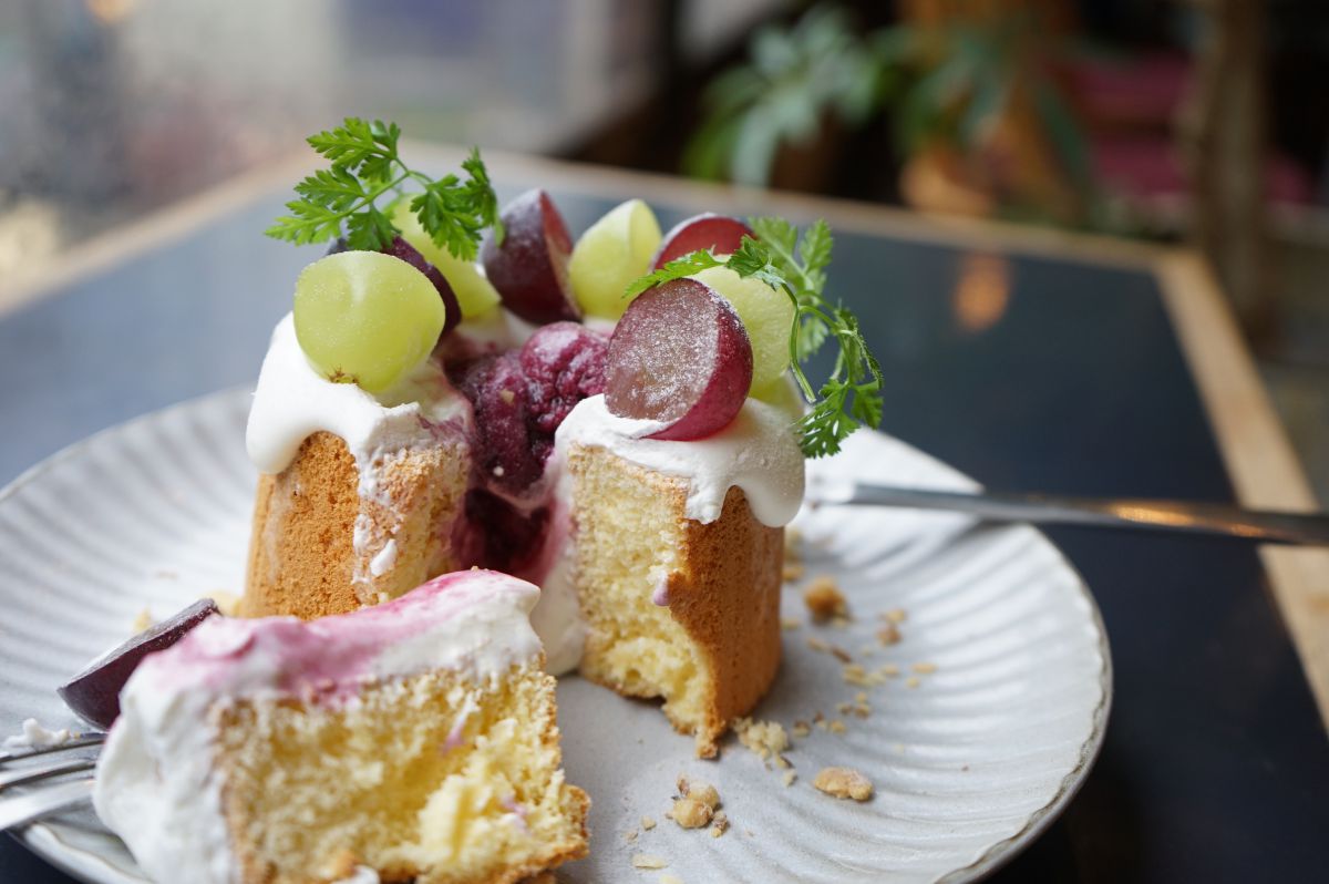 カットすると、真ん中にこっそり隠れていたホワイトチョコ入りのクリームとぶどうのジェラートが顔を出します。