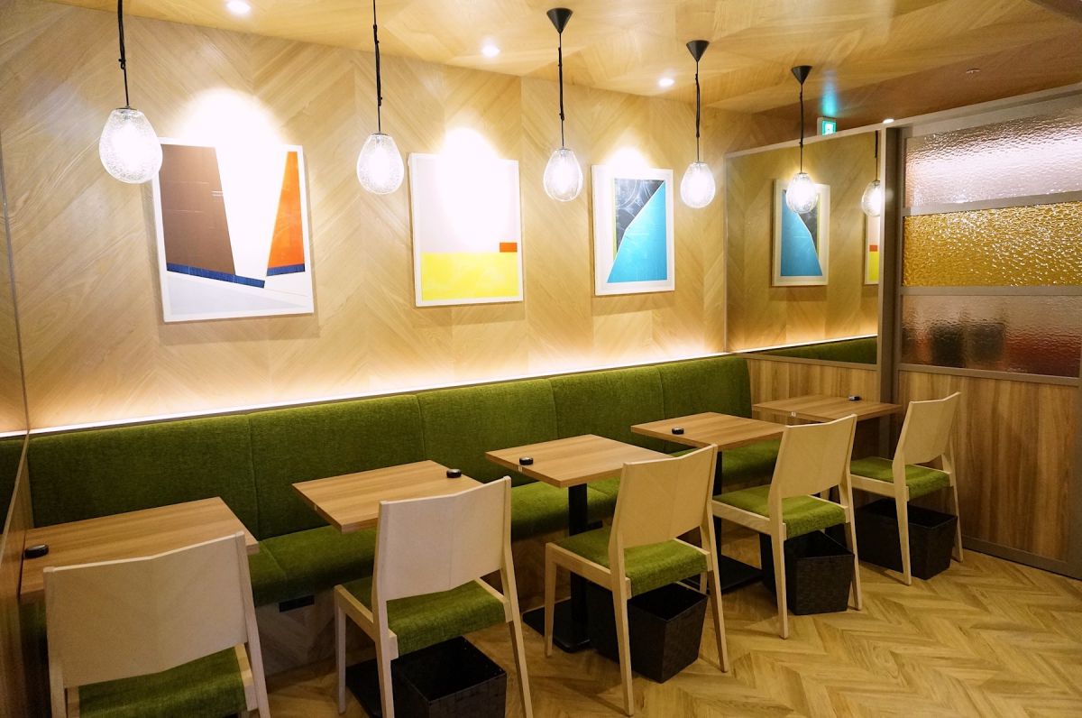 白木を基調とした清潔感のある店内。そこにやさしいライトの光と壁にかかったアートの色が加わり、温かみのある空間に。