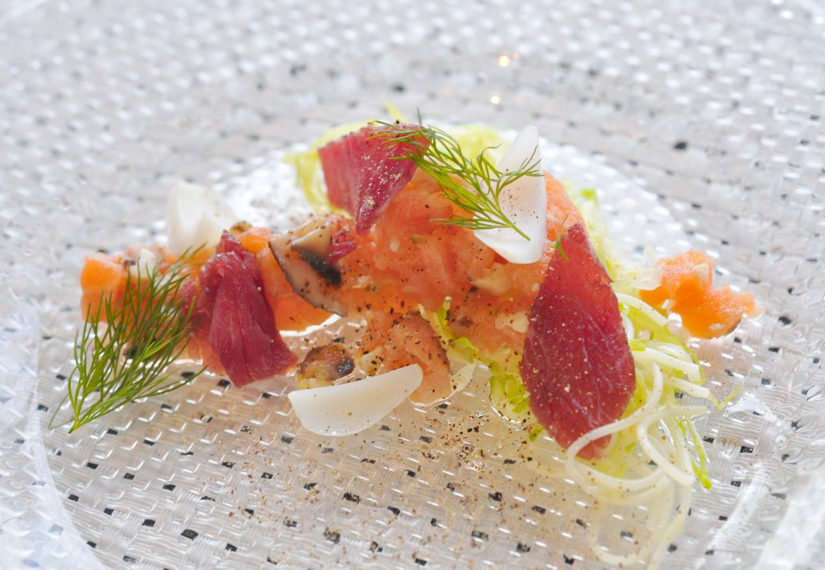 先付は自家製スモークサーモンのタルタル。和牛の自家製生ハム、ゆり根も添えた冷製カッペリーニは、ミックスして召し上がれ。