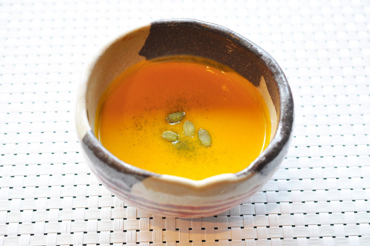 かぼちゃを贅沢に使ったスープ。ローストしたかぼちゃをマッシュして、塩麹と味噌で味付けた和風ポタージュです。濃厚な味わいで、スープというよりかぼちゃそのもの!