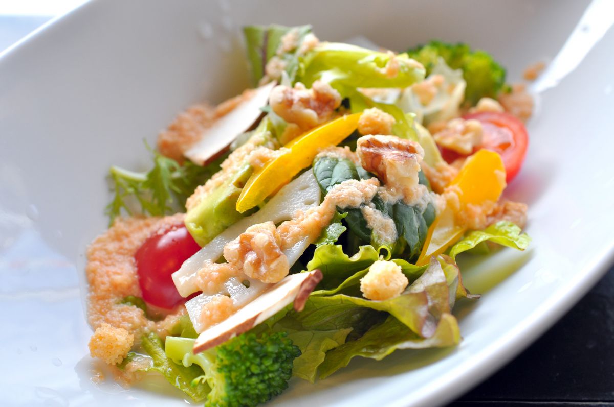 レンコン、くるみ、生食用マッシュルーム、アボカドなどを使ったカラフルなサラダ。旬の食材をふんだんに使った贅沢な一品です。自家製ドレッシングもいい味で、これを目当てに来る常連さんもいるとか。