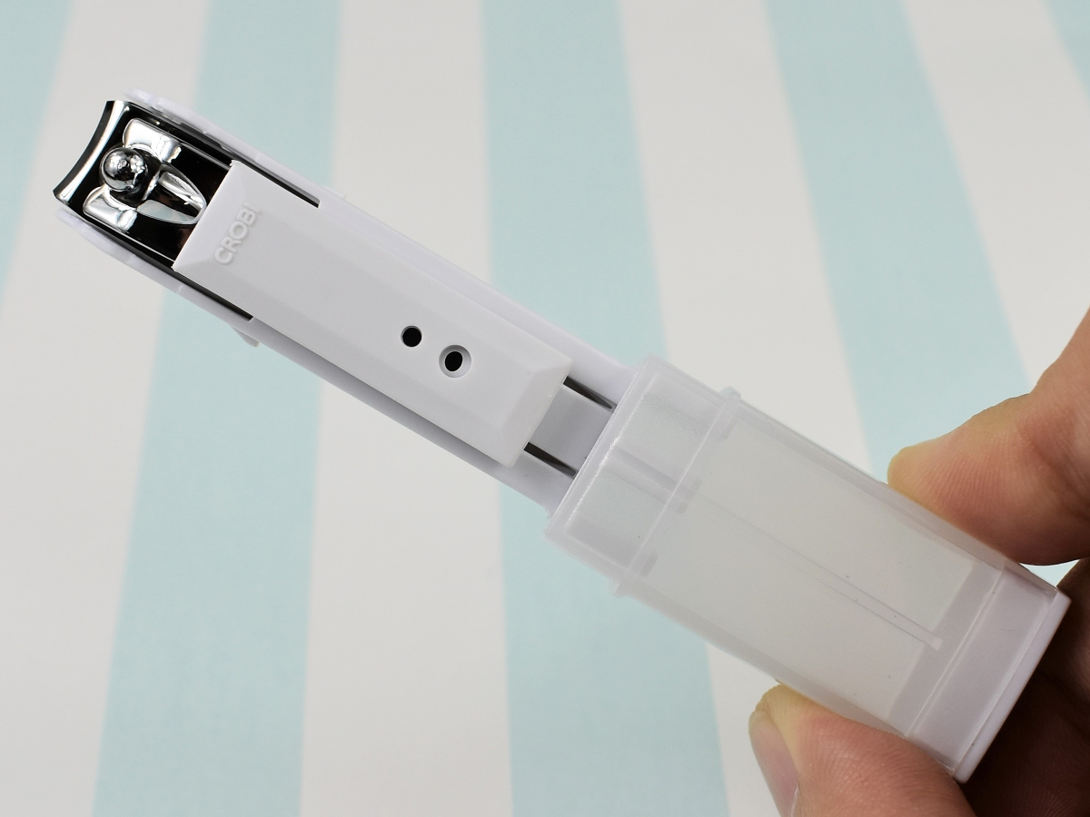 ここまでは一見普通の爪切りに見えますが、なにより注目すべきはギミック。透明なフタを外して爪切りを引っ張ると、まるでロボットが変形するようにケースから爪切りが伸びてきます。もともとケースだった部分がハンドルになるので、持ち手が長くて握りやすいのも高ポイント。軽い力で、簡単に爪を切ることができました!
