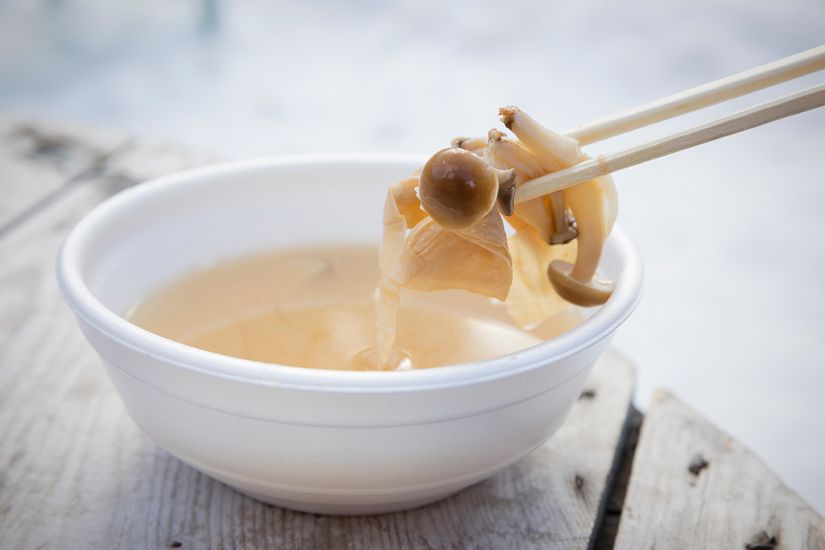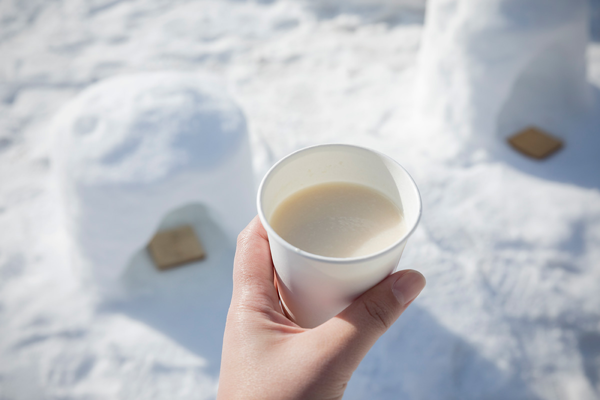 ほかにもかまくらが並ぶ沢口会場には売店ブースがあり、地産品で作った汁物など、体が温まるものを味わうことができます。かまくらを見ながらひと息つくのもいいですね。実際にきのこ汁(400円)や甘酒(200円) をいただきましたが、優しい味わいで身も心もほっこりしました。(※毎週水・木曜日はお休みです)