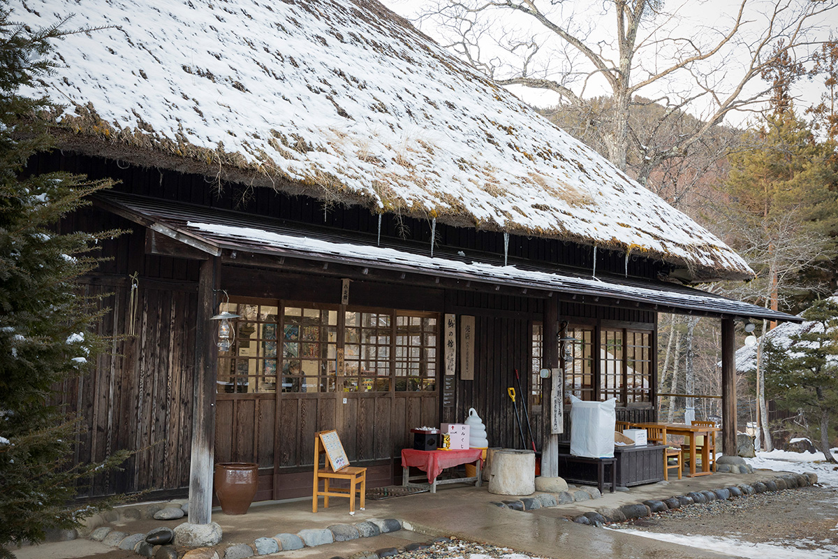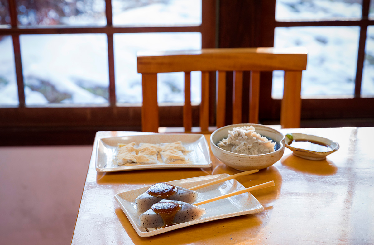 茅葺き屋根の建物が並ぶ敷地内に、ミニかまくらが点々と作られていて、雪深い山里らしい雰囲気で情緒たっぷり。展示を見つつ風情を楽しんだら、敷地内のお食事処「餉(かれい)の館」(10~17時、L.O.16時)でひと休みしてみました。