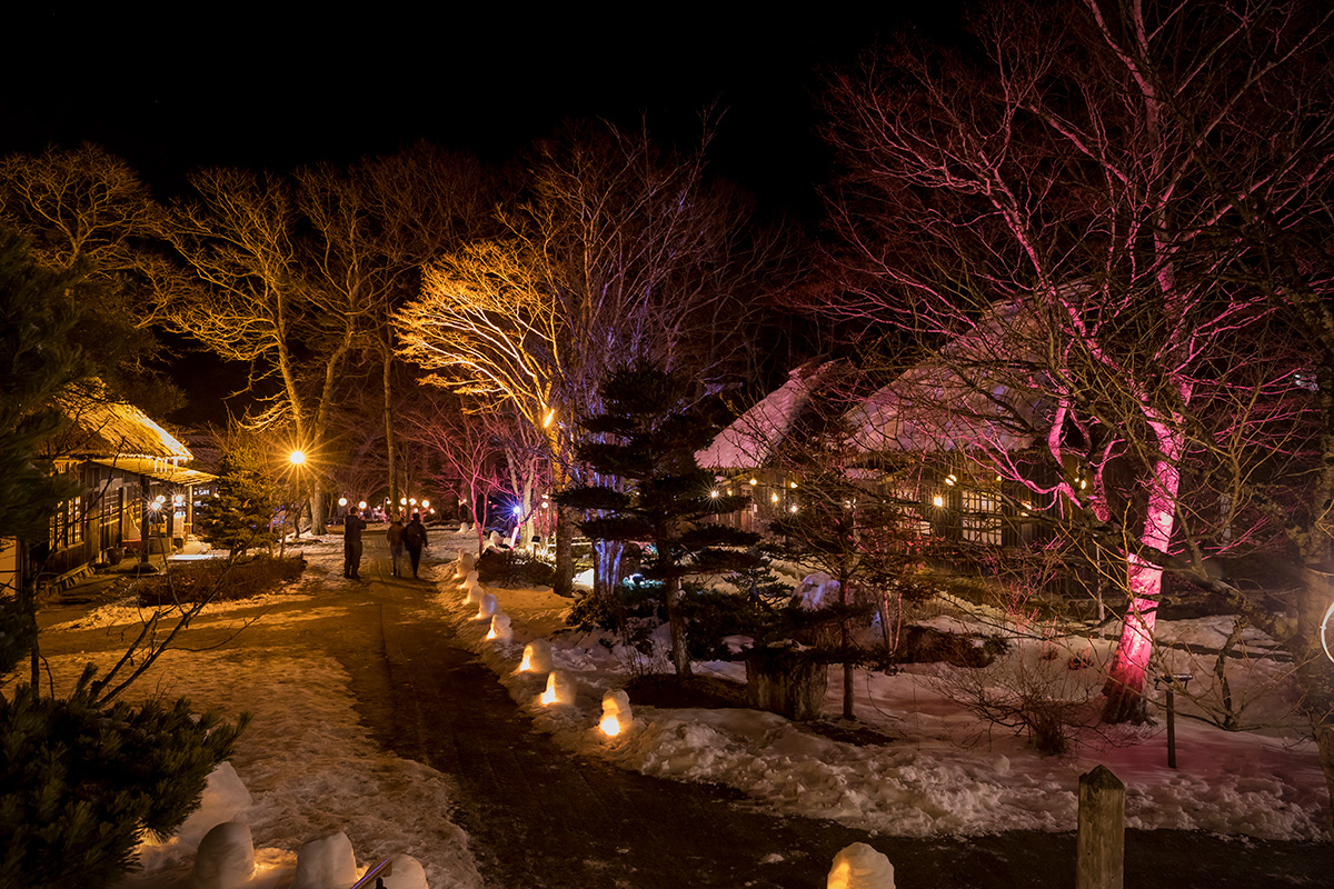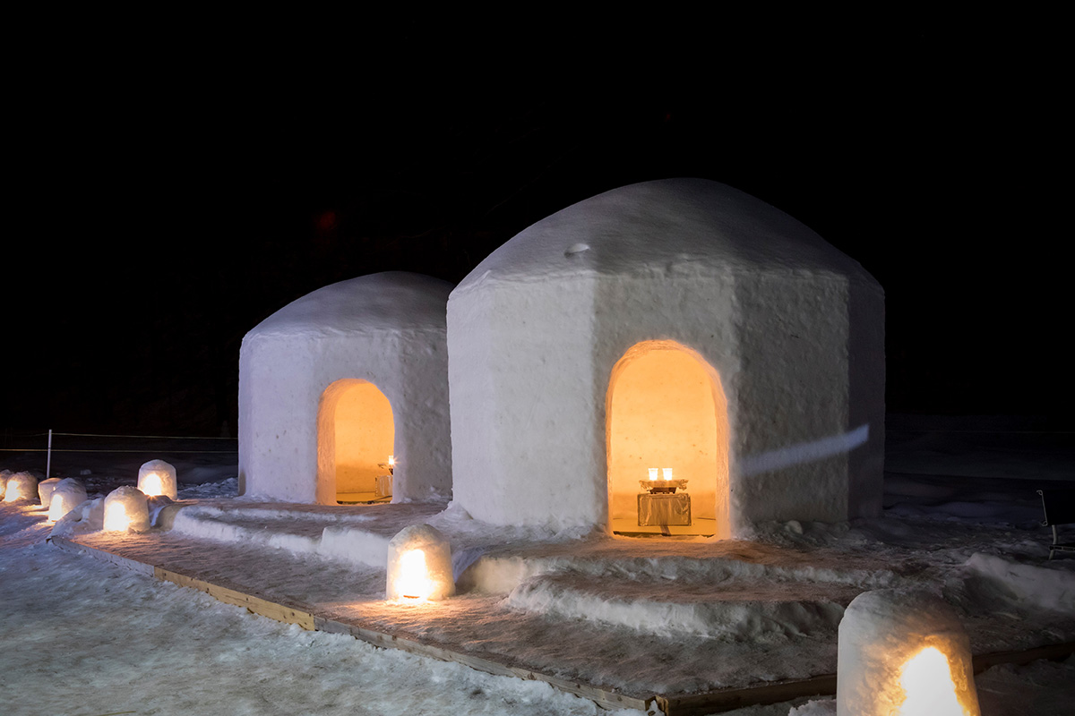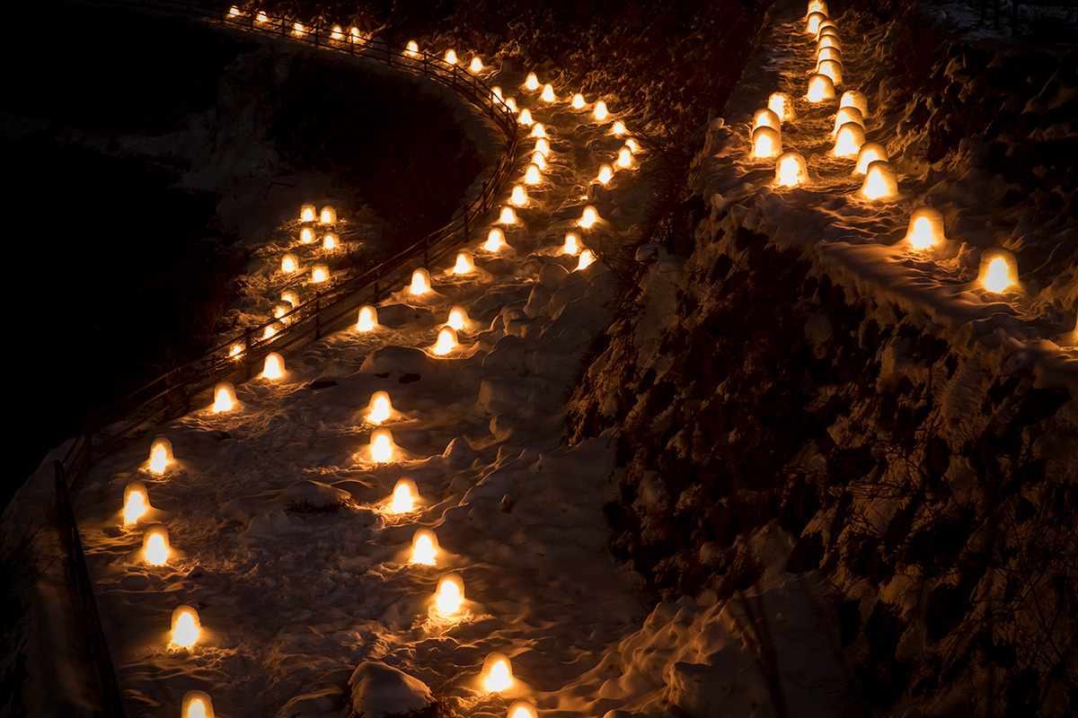 日没を待って再度訪れてみると、ミニかまくらのロウソクに火が灯り、周囲がライトアップされて昼間とは別世界のよう。“映え”な光景に思わずうっとり。