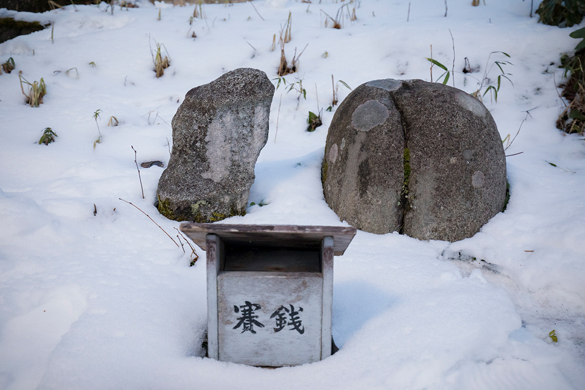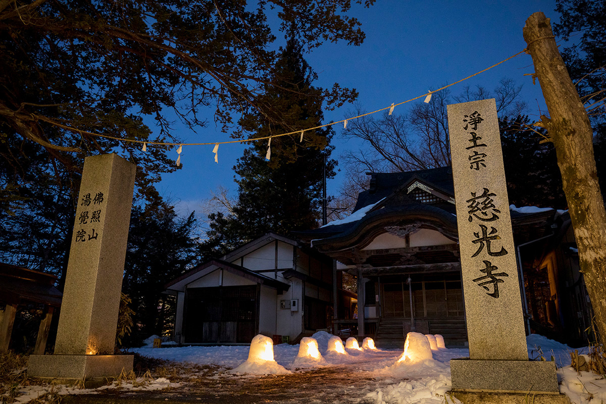 次に4つ目の会場「慈光寺」へ。このお寺は平家一門の菩提寺で、集落を見渡す高台にあり、子宝祈願に落人たちが参拝に来たとの逸話も残っています。創建は不明ですが、近隣にあった2つの寺院が慶長12年(1607年)にこの地に移されたという記録が残っているとのこと。雪景色の中、薄明かりにお堂が浮かび上がる様子は神秘的です。