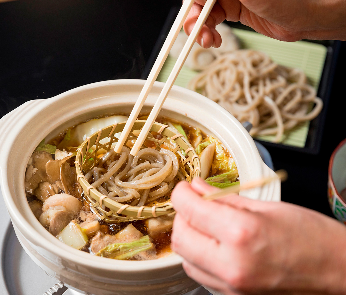 慈光寺のすぐそばには、知る人ぞ知るそばの名店「平家そば 志おや」があるので、散策途中の腹ごしらえにぴったり。南会津産のそばを石臼挽きし、手打ちする香り高いそばは絶品なんです。ここでかまくら祭期間中だけ味わえる、鴨鍋とうじそば(あったかセット、1人前1800円)もぜひチェックして。国産合鴨と野菜がたっぷり入ったアツアツの鴨鍋に、自慢のそばを投じて味わえば、体中に旨みが染み入るようです。