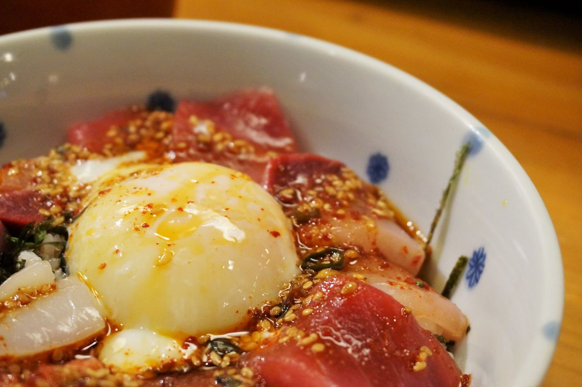 ・「ピリ辛海鮮丼(刺身・胡麻・唐辛子・醤油・温泉卵)」