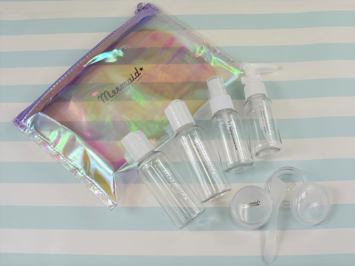 ピンクがかってキラキラとした半透明のポーチの中に、複数の詰め替え容器が入った同商品。ポンプボトル(40ml)・スプレーボトル(40ml)・ヘラ各1つに加え、ボトル(50ml)とクリームケース(10g)は2つずつ入っています。ポーチと詰め替え容器にはそれぞれ可愛い字体の英字がデザインされていて、見た目がおしゃれなのも魅力的。またポーチが透明で、何が入っているか一目でわかりやすいです