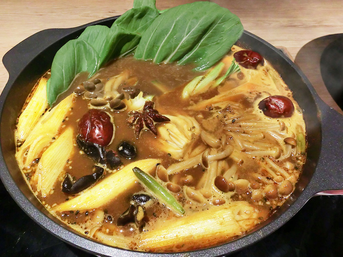 こちらの火鍋のマーラースープは自家製の豆板醤をベースにした辛さが特徴。特に後半には辛さが増すので、味の変化も同時に楽しめます。