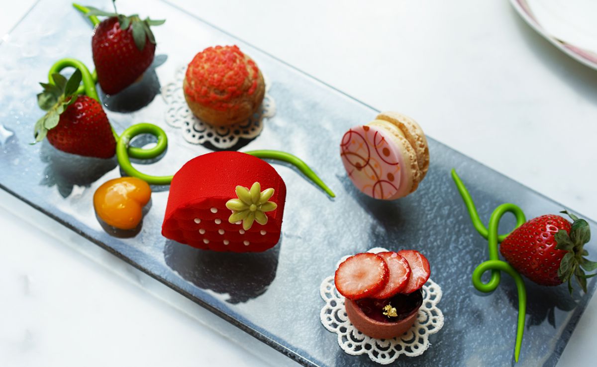 パイ生地で編んだバスケットに、いちごとフランボワーズやブルーベリーをふんだんに盛り込んだ「パイのいちごバスケット」、スポイトに入った甘酸っぱいソースを注入して、味を調整できる「スパークリングワインジュレといちごのルバーブソース」など小さな世界の中に凝った演出がなされているのも「リーガロイヤルホテル」アフタヌーンティーの魅力。