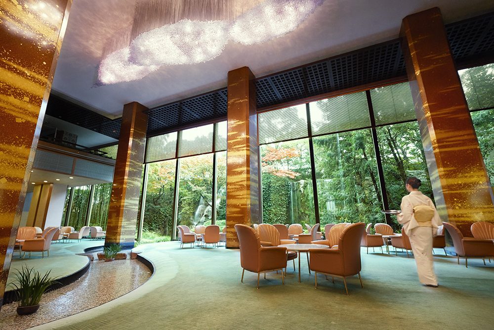 アフタヌーンティーがいただけるのは、1階のメインラウンジ。2階まで吹き抜けになった開放感あふれるフロアには、漆の柱、曲水のせせらぎ、紫雲がたなびくさまを表現したシャンデリなどクラシカルに彩られたインテリアで非日常の世界へいざないます。