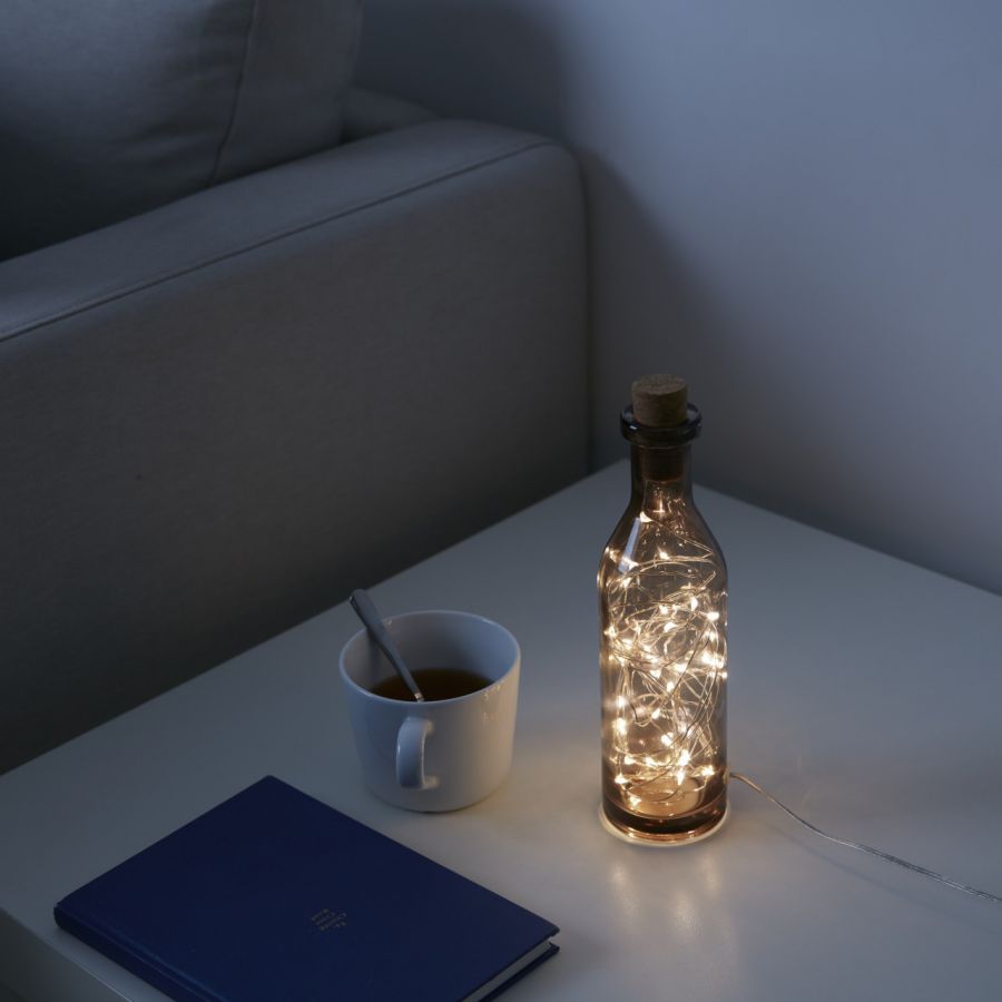 ボトルライトをサイズ違いで2、3個置いて飾ってもOK。ソファのくつろぎタイムにぴったりです。