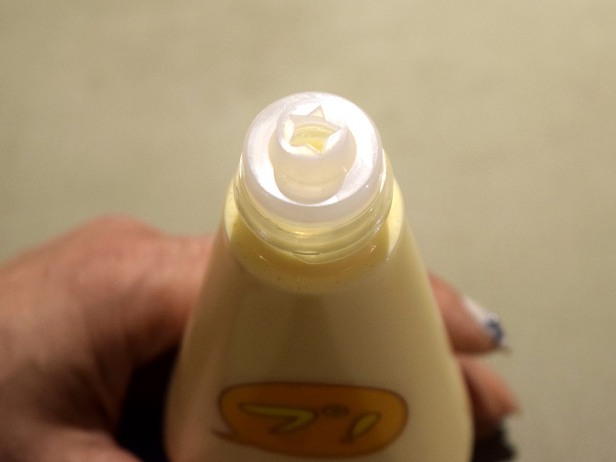赤いキャップを外して飲み口を見ると星型。「やっぱりマヨネーズのボトルだ!」と盛り上がってしまいます。キャップのままでパチリ、キャップを外してもパチリ、写真を撮らずにはいられません。
