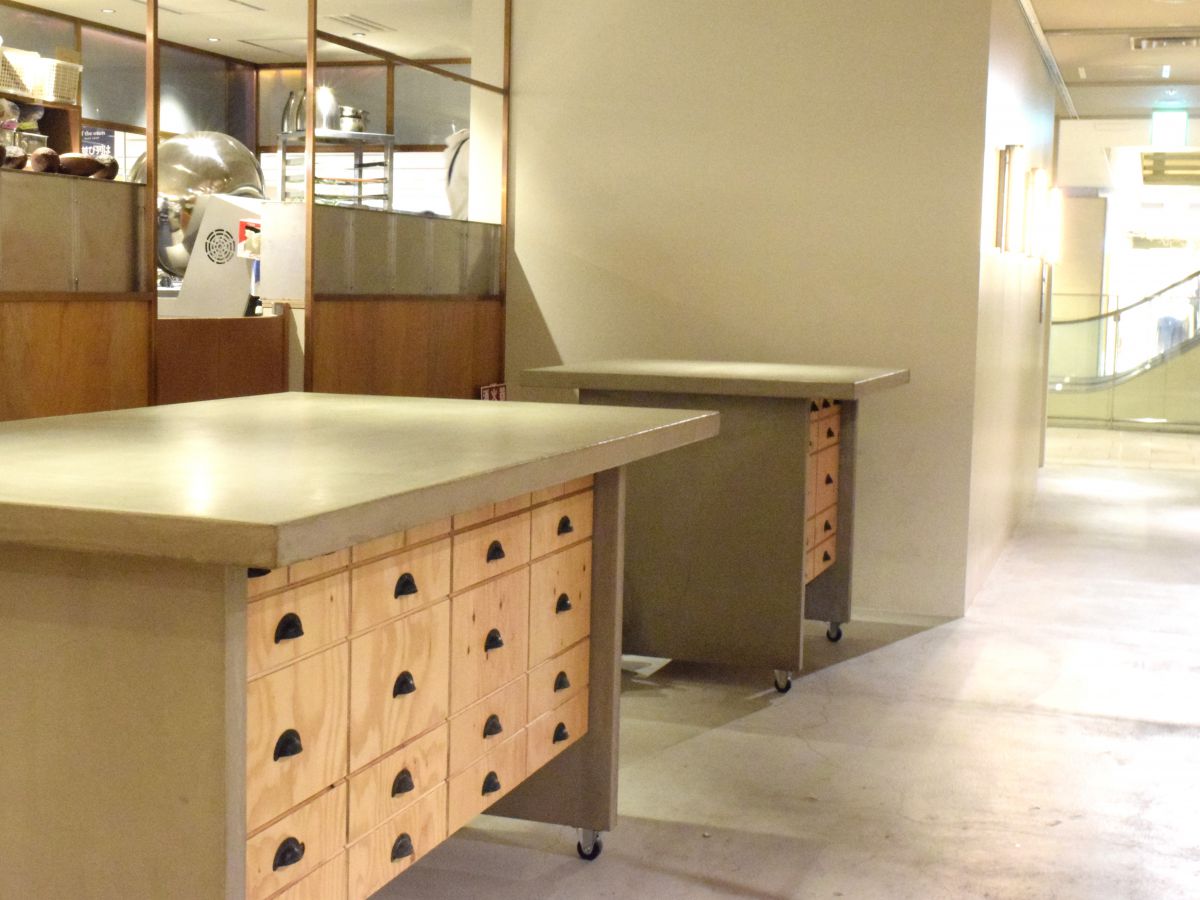「SIGN OF THE FOOD」の専門店の中程には、おしゃれなテーブルコーナーが置かれています。通路から隠れたこの場所なら、買ったばかりの「チューチュープリン」をチューチューしても平気です
