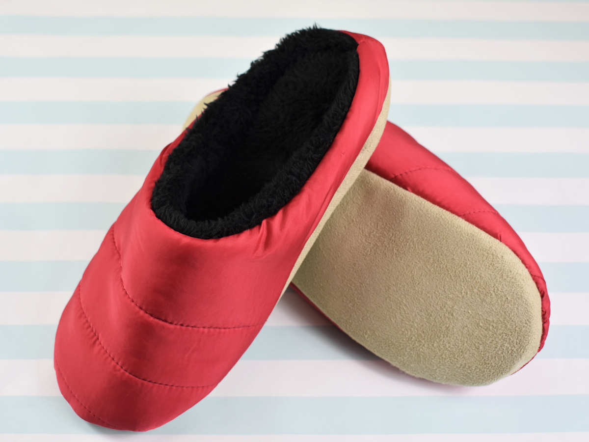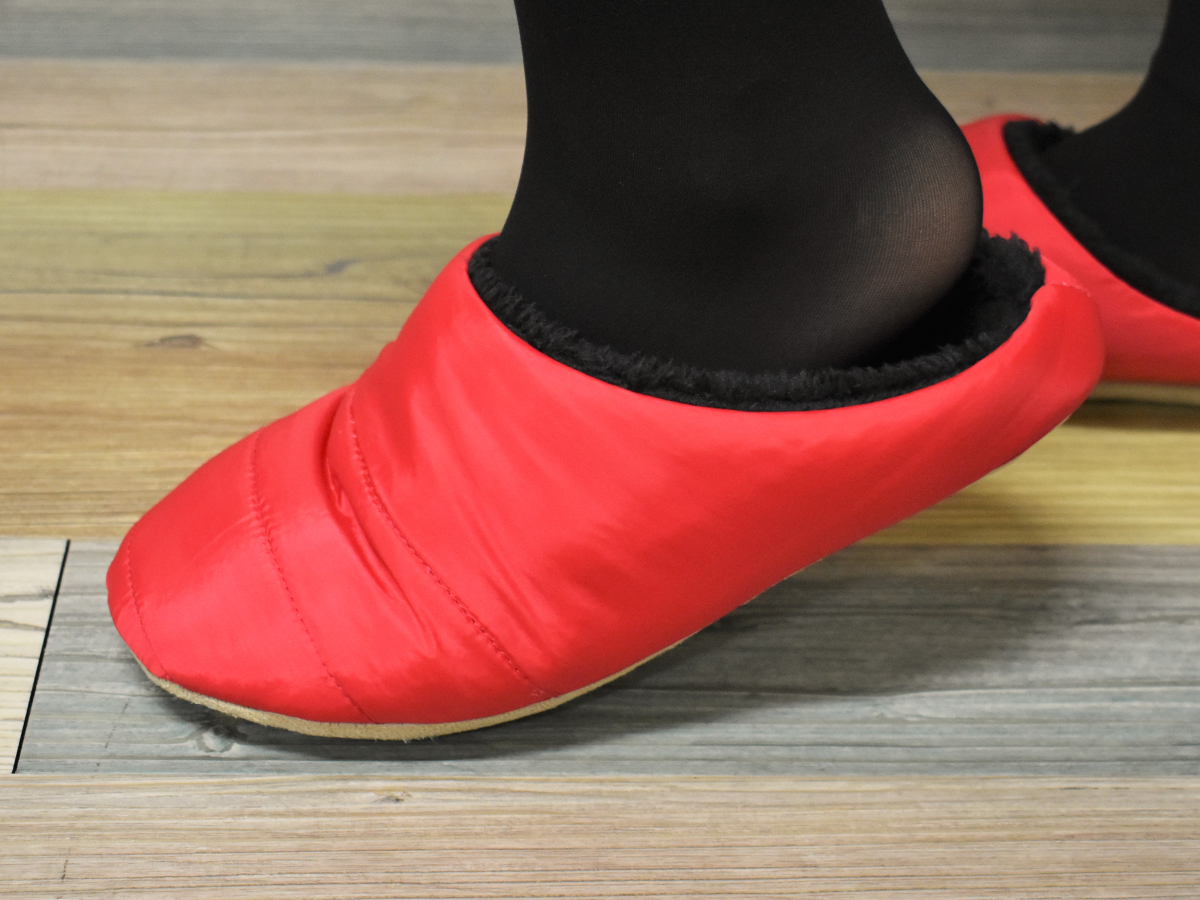 シンプルな赤色が映えるおしゃれなデザインの同商品。素材にポリエステル100%・ポリウレタンフォーム・EVA樹脂が使用されています。色合いと素材からも暖かそうな雰囲気が伝わり、期待大ですね。ルームシューズのサイズは23~24.5cm。履き口が広く、対応サイズに余裕があるのも嬉しいところ。ただし濡れた場所やコンクリート、タイル上での使用は非推奨なので要注意。リビングか自室のみで使用するのがいいかも。