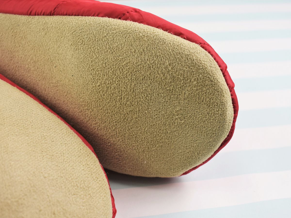 外側はダウンジャケットのように表面がツルツルで、外気からがっちり足をガード。内側には足元を包み込む柔らかな毛が広がっていました。底面は歩いている時や立ち上がった際に滑りにくそうな作りで安心です。