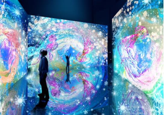 今回クリスマス限定の演出がみられるのは2作品。1つ目は、壁に触れるとクラゲが生まれる「Fluid Wall」エリア。95%が水分のクラゲが海中で生まれ、また流れるように消えていく、美しくも儚い一瞬を表現したフルイドアートに、儚い雪が降り注ぎます。クラゲがたゆたう幻想的な世界と、輝く純白の雪がマッチング。