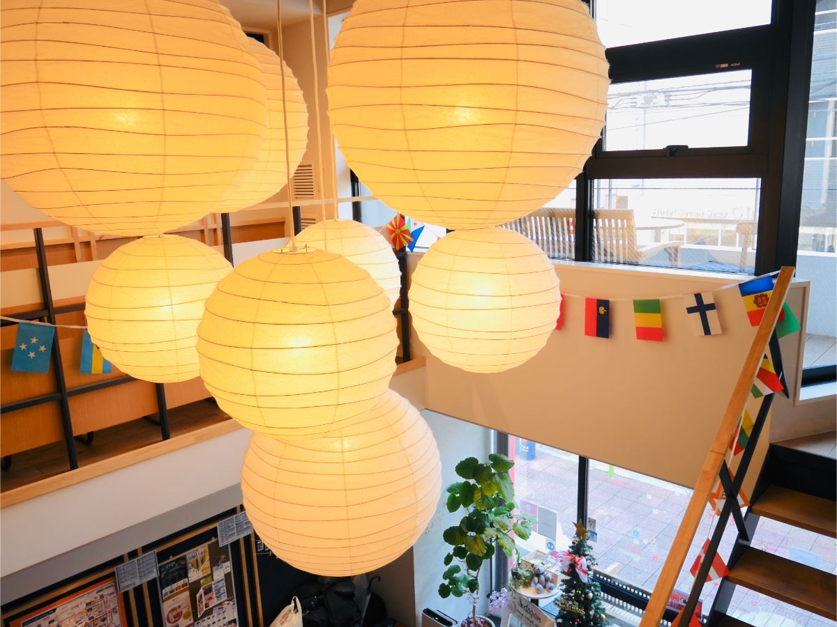 見上げると、吹き抜けの天井からつるされた大きなライトがとても印象的!