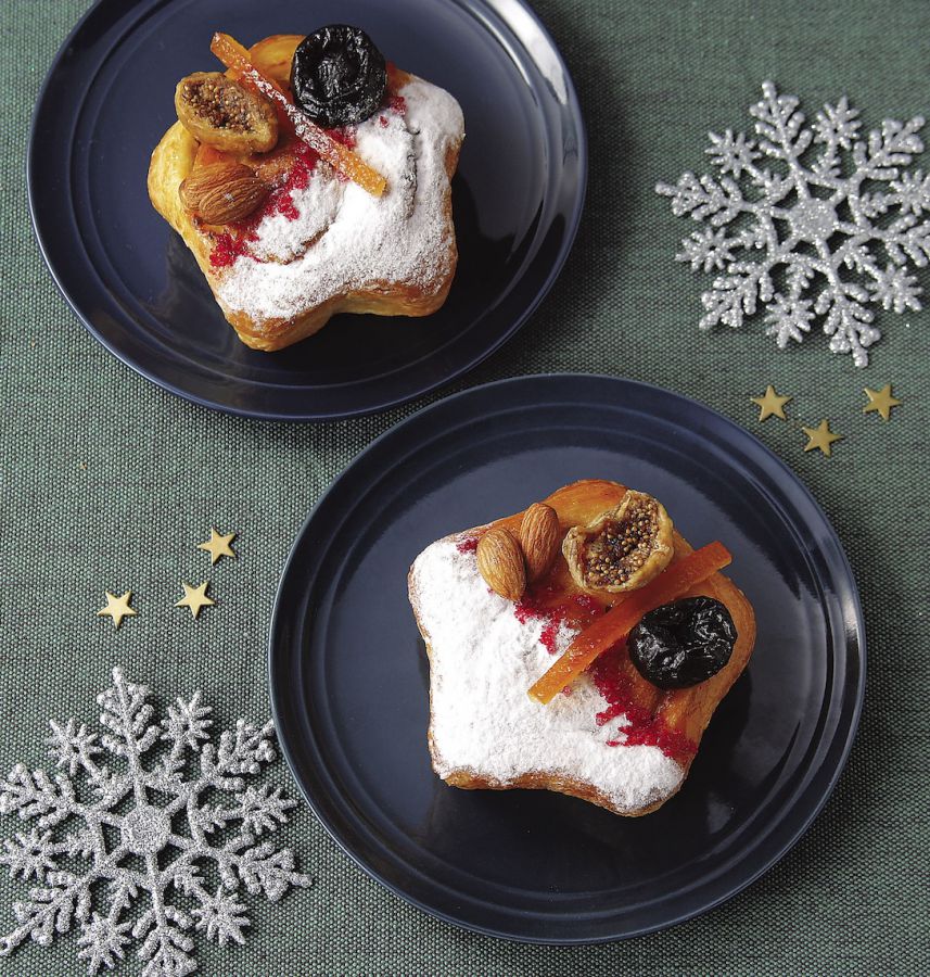 「カカオとドライフルーツのデニッシュ」260円は、チーズクリームを塗ったクロワッサン生地に、カカオニブを巻き込み焼き上げ、仕上げにドライフルーツをトッピングした、クリスマスらしく贅沢な気分が味わえるパン。去年より華やかさと食べやすさがアップして登場です!